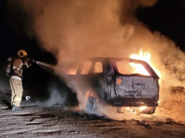 O Corpo de Bombeiros Militar foi acionado por volta das 21h e, ao chegar ao local, encontrou o veículo tomado pelas chamas.